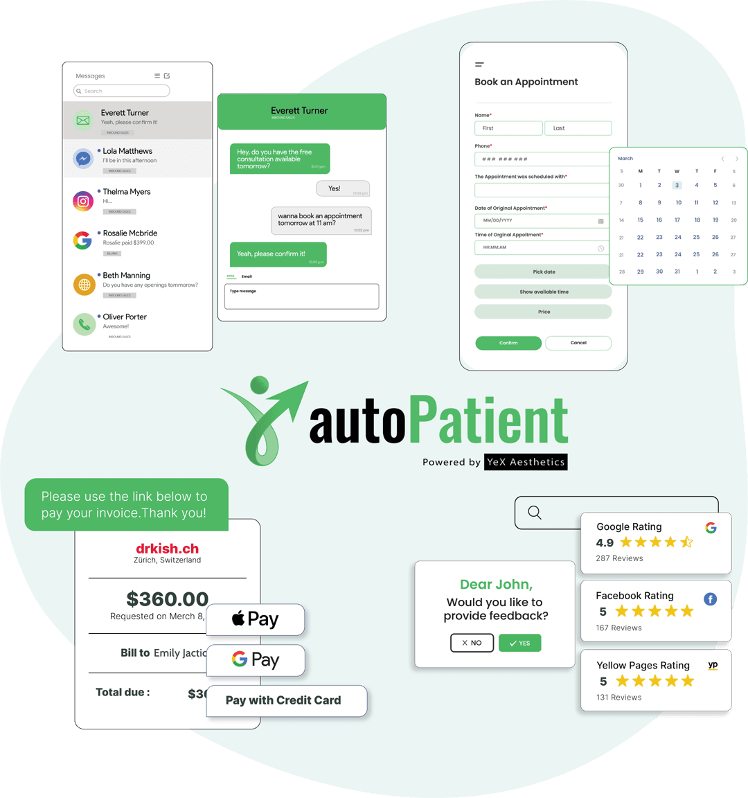 autoPatient levels up your patient experience quickly by offering your patients multiple convenient ways to book appointments and ask questions without taking up your staff’s time. With our sleek customizable and embeddable booking system, patients will be able to book appointments themselves 24/7 on their phones or computers. Not only on your website, autoPatient scheduling connects to your Google My Business, Facebook, Yelp and more, and integrates directly with your patient management system so your availability is synced in real time. If your patients have questions before booking, our AI booking bot can answer FAQs and book appointments through personal conversations.